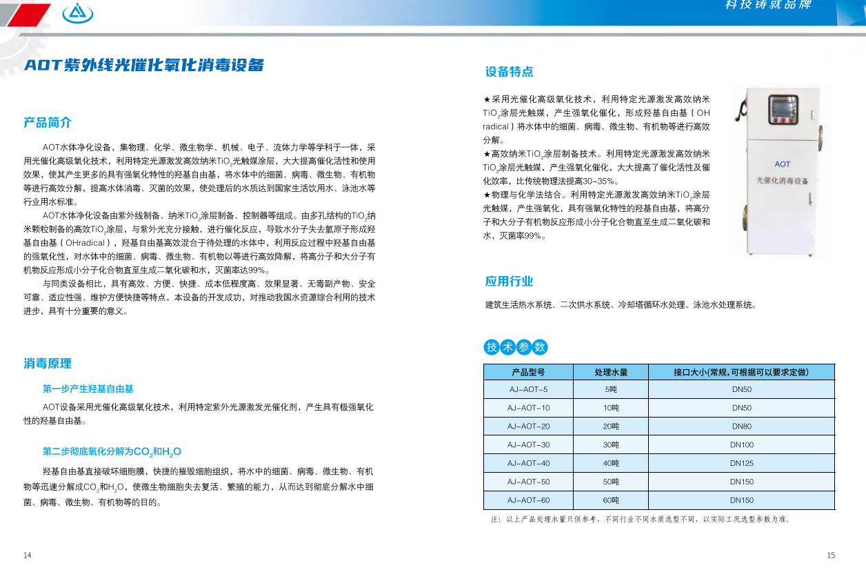 AOT光催化设备利用先进的光催化技术对水体中的有机物、微生物、病菌病毒等进行彻底的氧化分解,在此过程中不添加任务化学制剂,不生成任何有害的副产物。